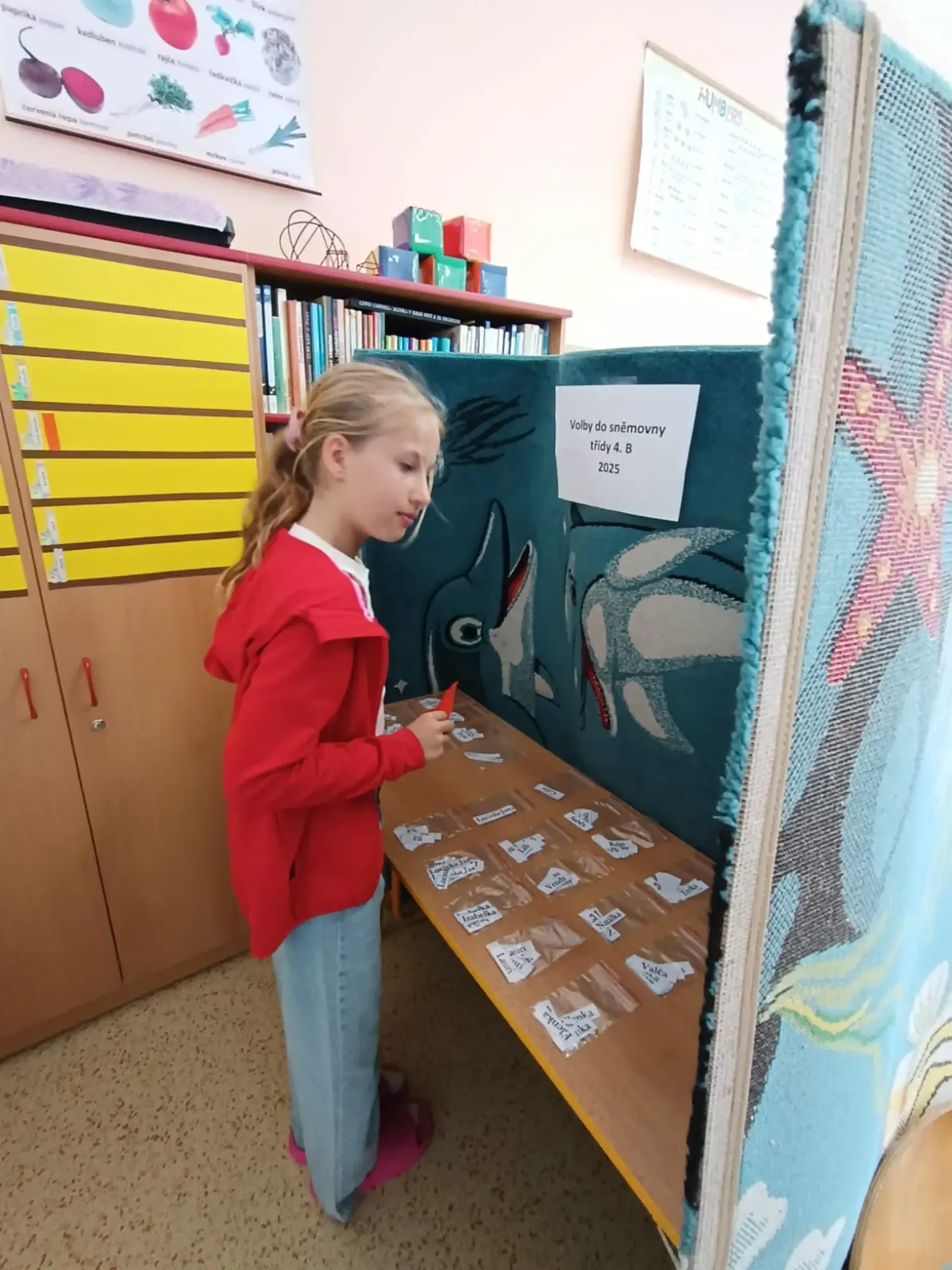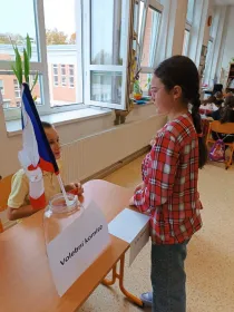 Žáci si přinesli platný doklad (OP, kartičku na dopravu...), třída se proměnila ve volební místnost. Byla zvolena volební komise, která kontrolovala platnost dokladů a obálek, které si žáci k tomu účelu vyrobili a paní učitelka je orazila.