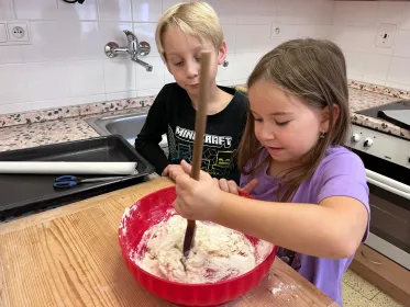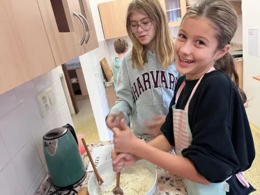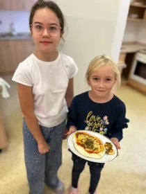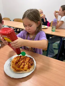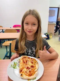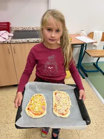 Na druhé lekci našeho vaření se z kuchyňky linula vůně čerstvé pizzy. Děti si nejprve samy vytvořily těsto. Naučily se, jak správně těsto míchat a rozválet. Poté si každé z nich vybralo, co na pizzu patří. Někdo zvolil klasiku se sýrem a šunkou, jiní experimentovali s kukuřicí. Výsledkem byly krásně křupavé pizzy, na které byli malí kuchaři právem pyšní.