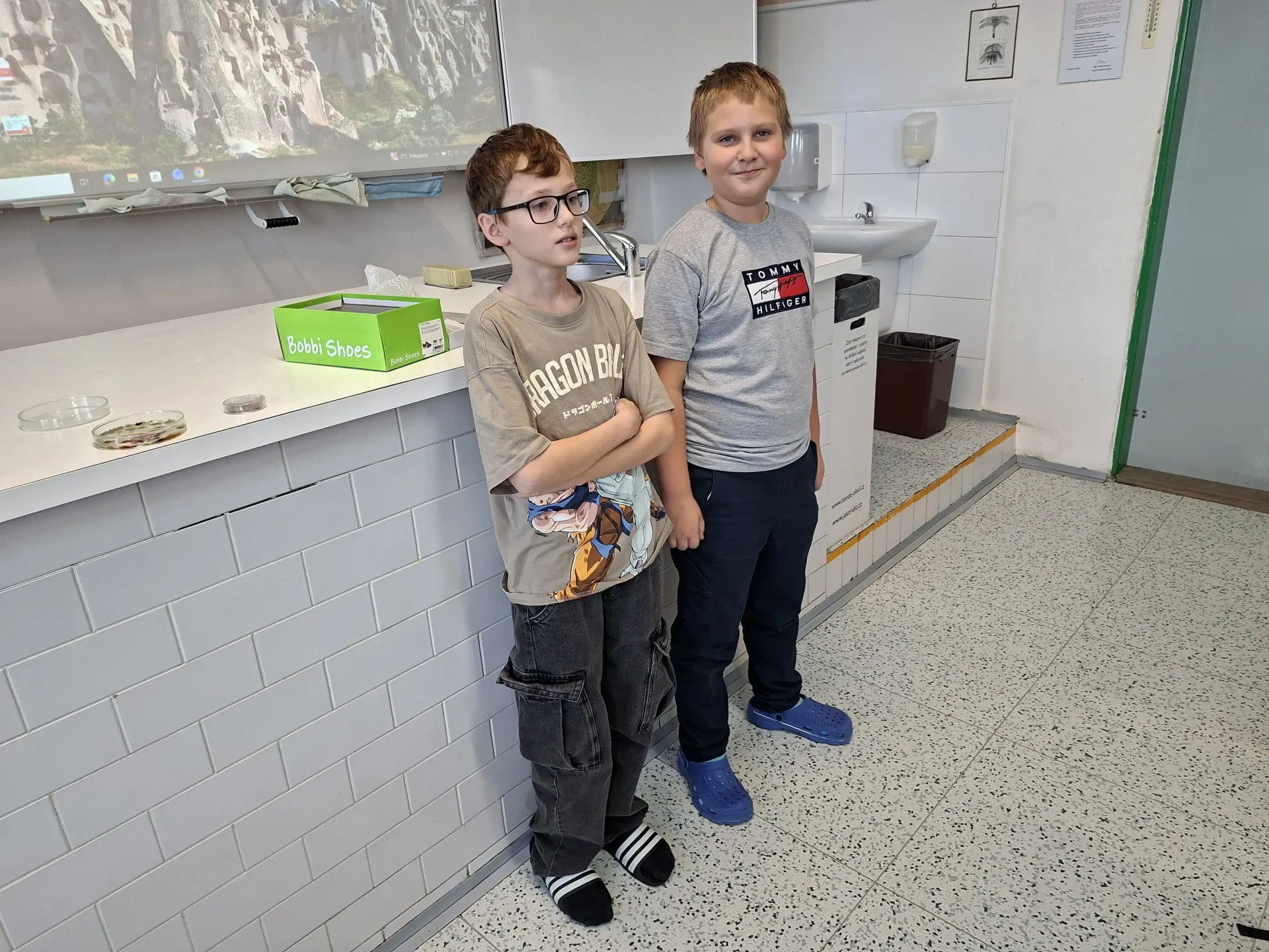 V rámci současného učiva v šestém ročníku, které se týká buněk a jednobuněčných organismů, se žáci 6.A Vojta Vreba a Jirka Urban zapojili do dobrovolného experimentu s kultivací bakterií a plísní, přičemž projevili velkou zvídavost, pečlivost a zájem o vědu. Jejich pokus s "pěstováním" bakterií na Petriho miskách byl nejen velmi dobře připravený, ale také perfektně provedený. Kluci pracovali jako opravdoví malí vědci. Za použití agaru a potravinářské želatiny vytvořili živnou půdu pro bakterie, které získali stěrem z obyčejné kliky u dveří. Výsledkem jsou krásné kolonie bakterií i plísňových kultur. Za jejich nadšení a chuť objevovat nové věci jim patří velká pochvala. Vědecký svět potřebuje přesně takovéto nadšené badatele. Jen tak dál:-).