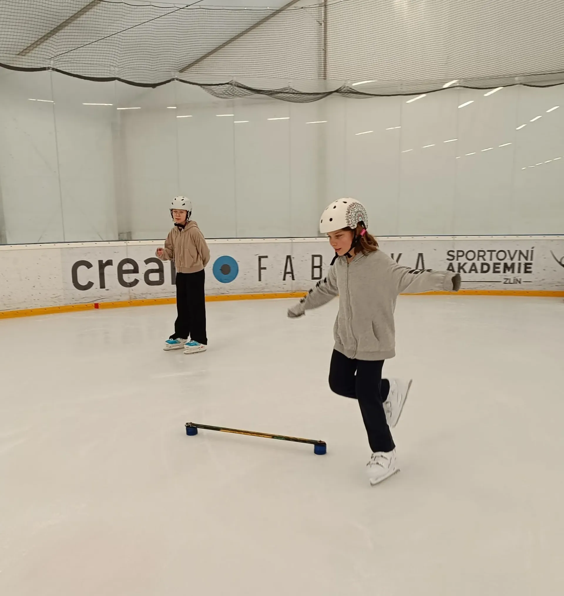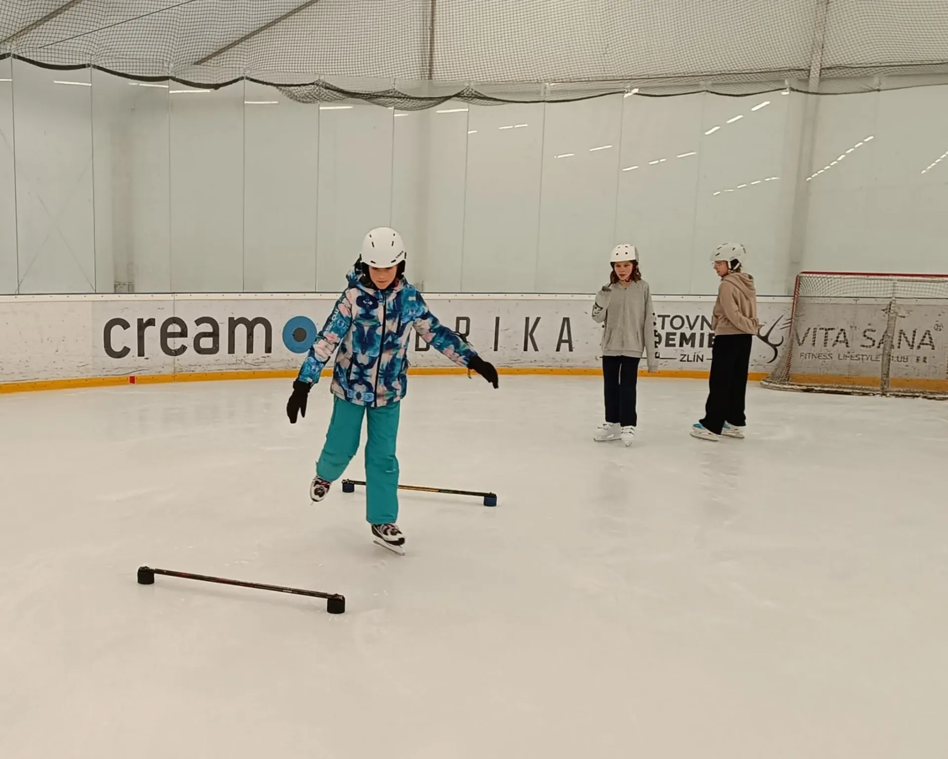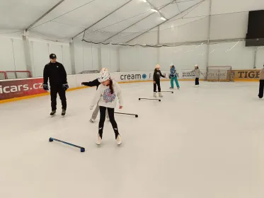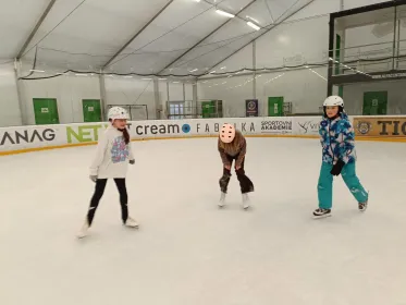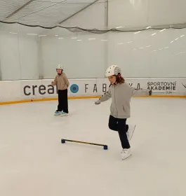 Na ledě na nás čekala čtyři stanoviště s různými úkoly. Učili jsme se nové věci a hodně jsme se nasmáli. Celou hodinu jsme bruslili a moc nás to bavilo.