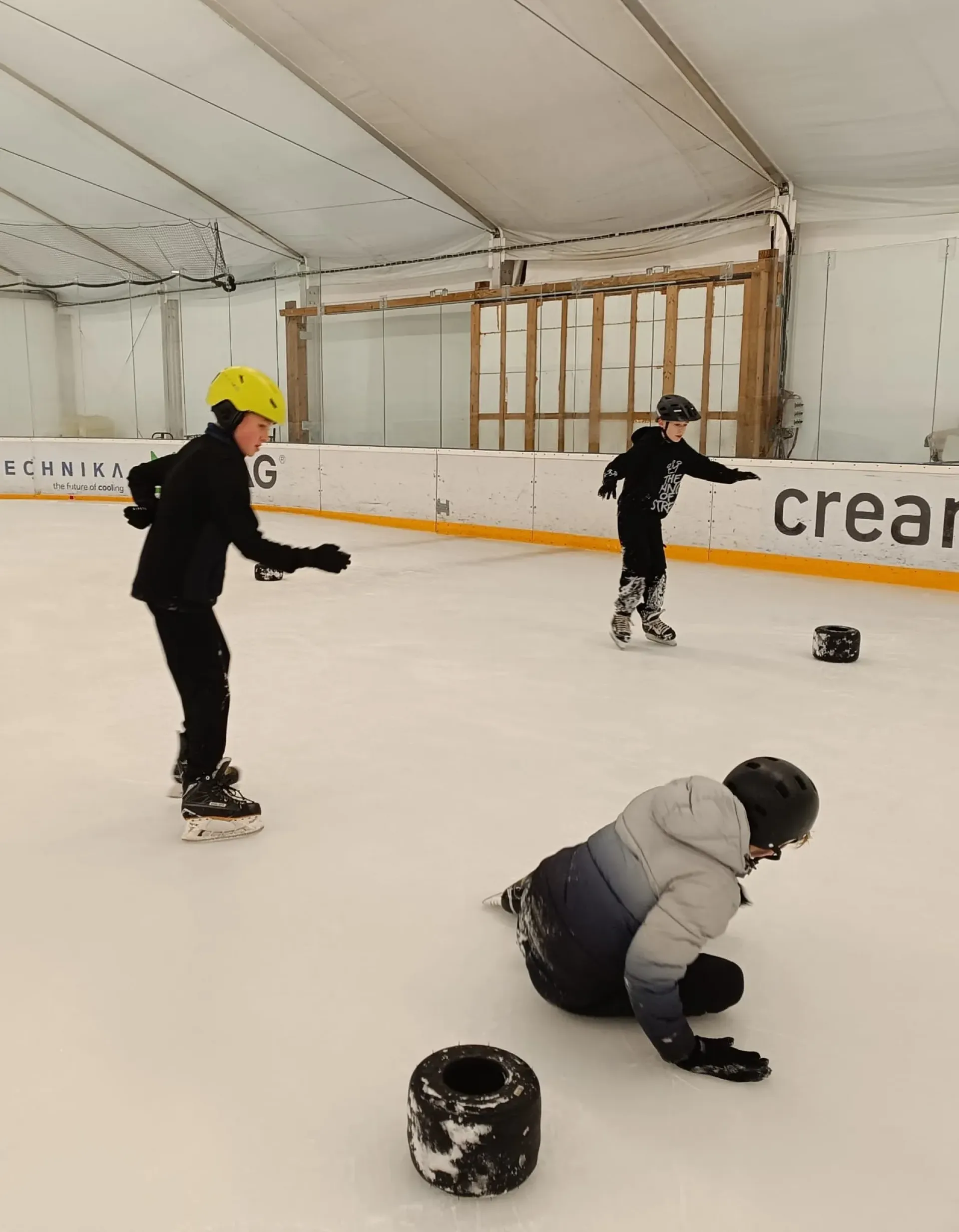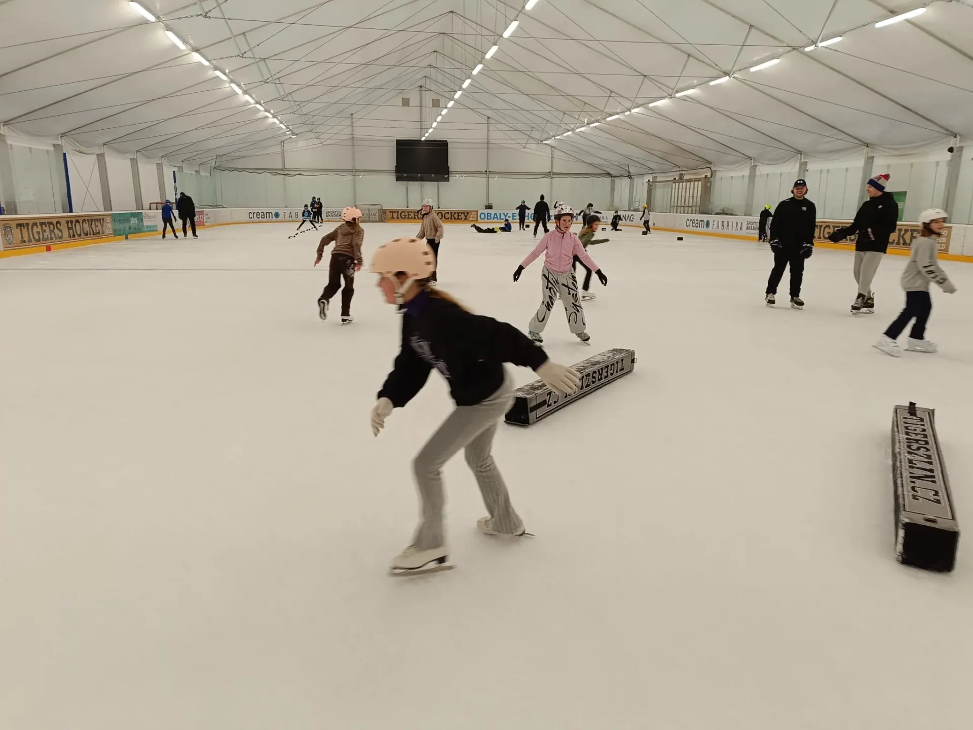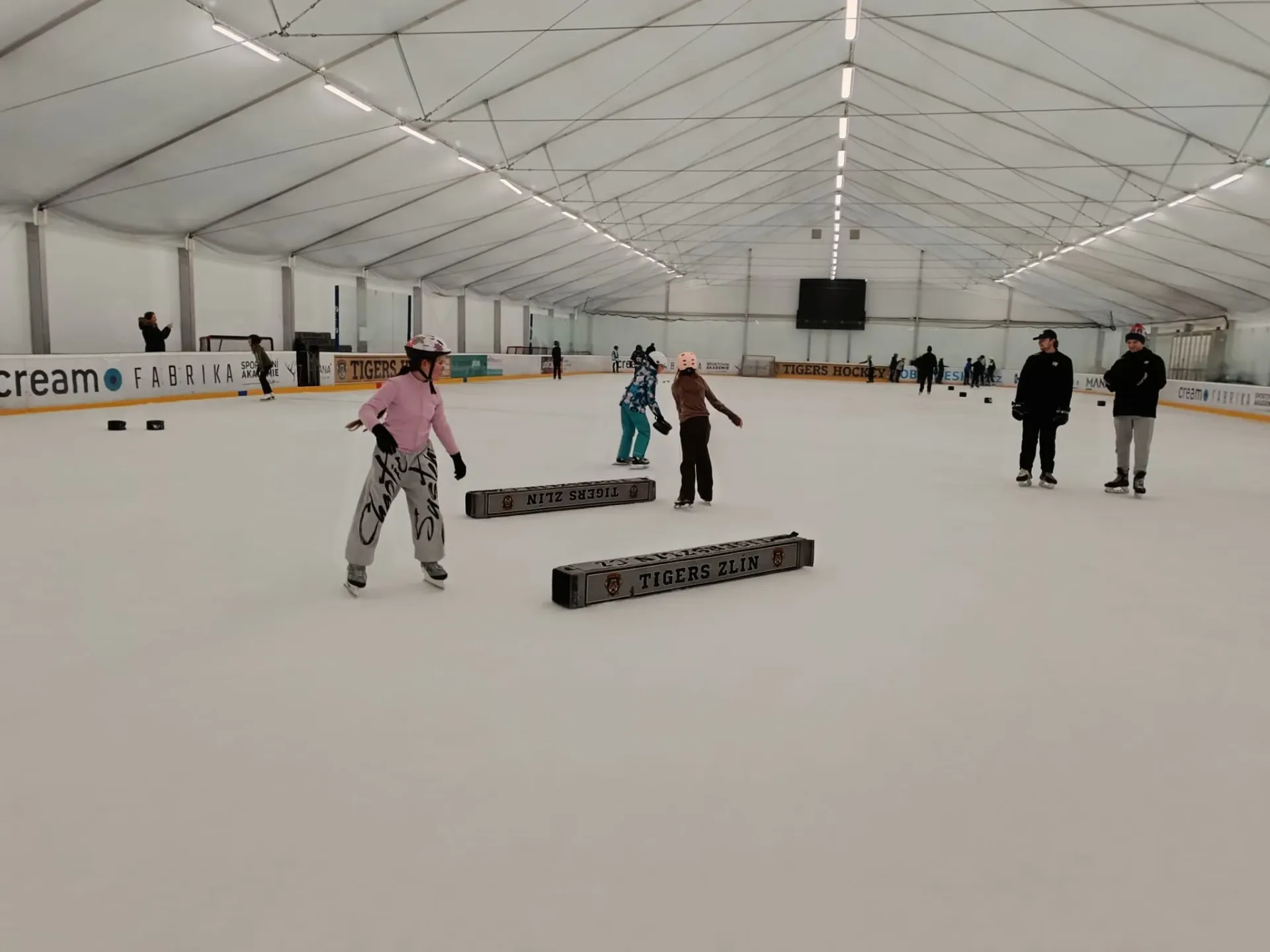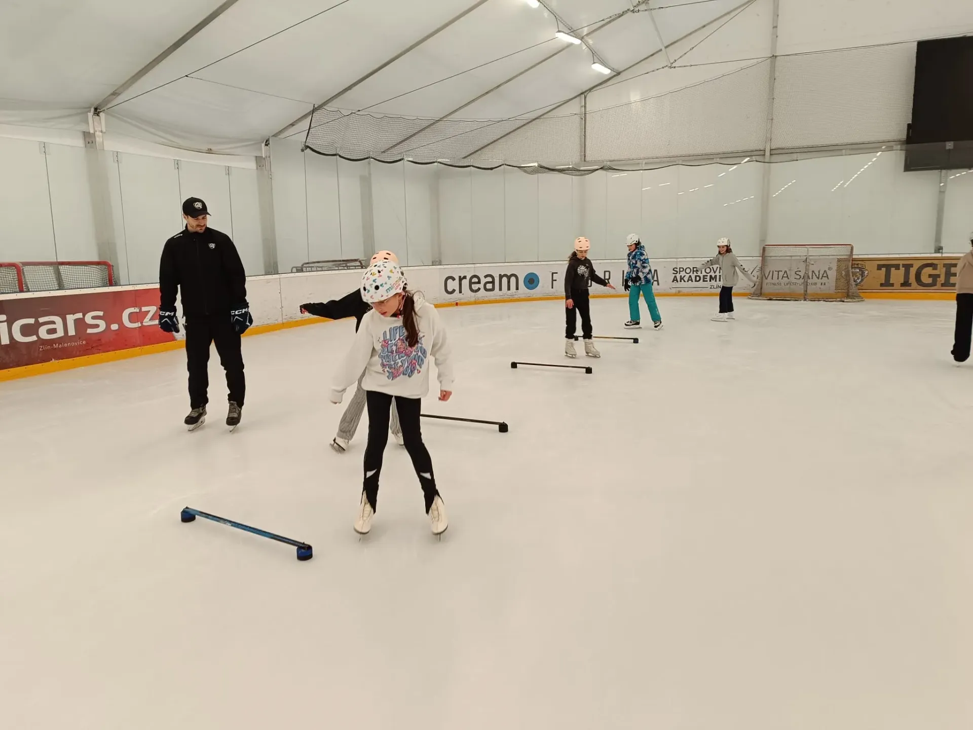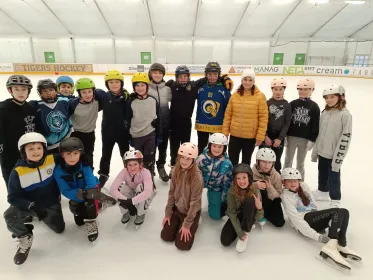 V den vysvědčení nás paní učitelka a paní asistentka vzaly bruslit. Moc jsme se těšili. Když jsme přišli na stadion, rozdělili nás do čtyř skupin. Každá skupina měla svého trenéra.