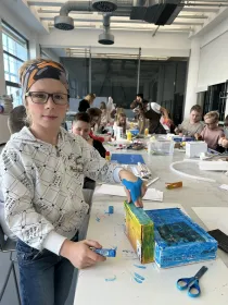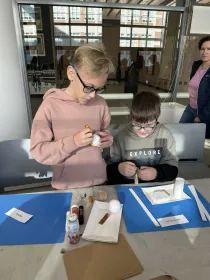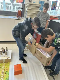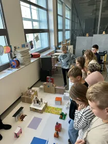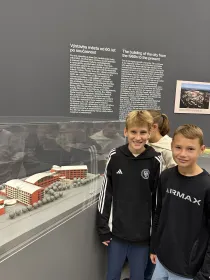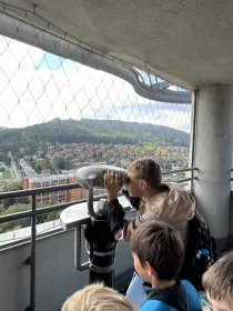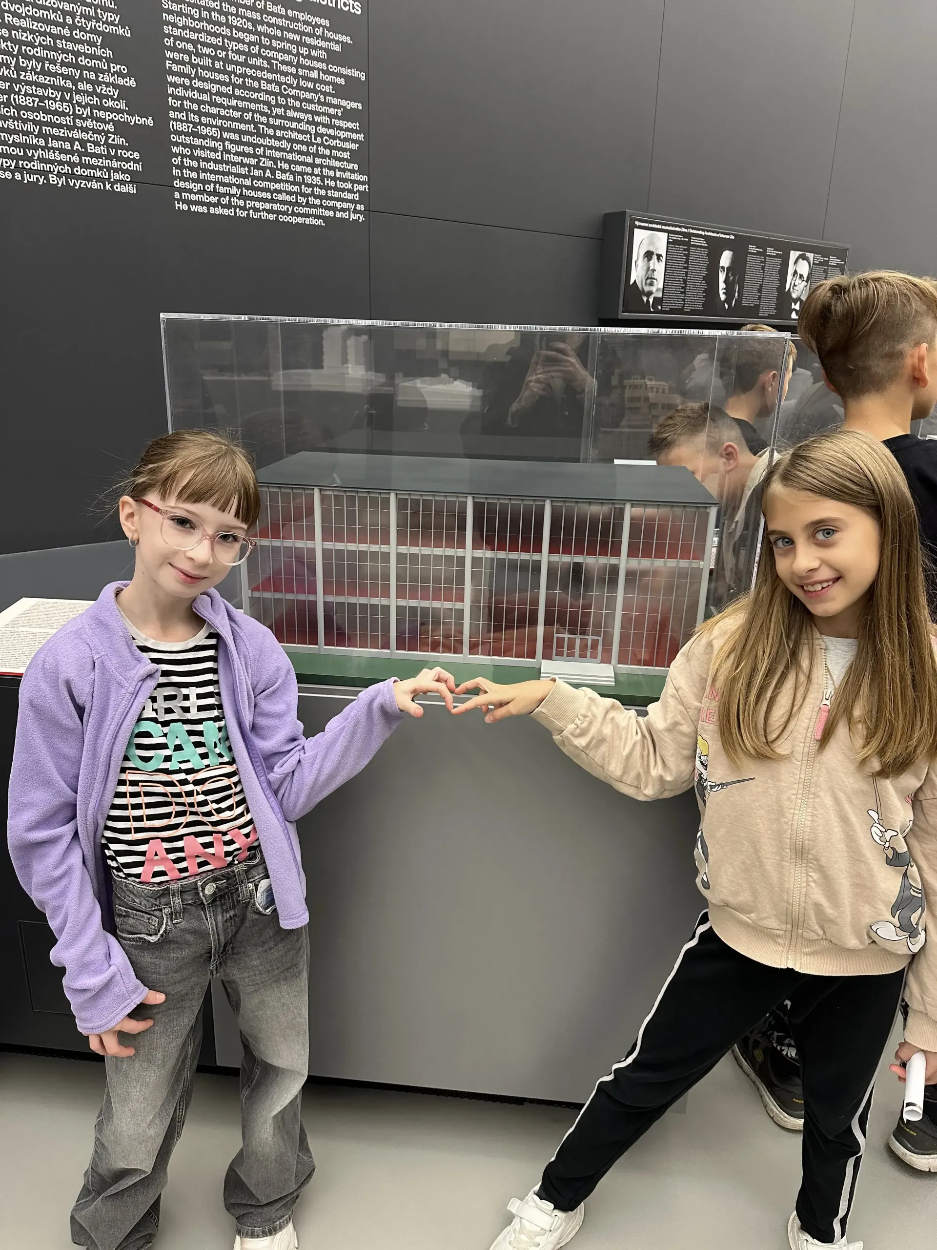 Potom jsme šli na 14. a 15. budovu, kde jsme si prohlédli zmenšeniny staveb Zlína - Baťovy domky, nemocnici, Obchodní dům, Baťův památník a mnohé další. Dozvěděli jsme se také, jak vznikal Zlín. Potom jsme si vyrobili 3D model vlastního města z kartonu. Zašli jsme si také do pekárny na dobrůtku. Snědli jsme si ji na terase Baťova mrakodrapu, kde jsme vyjeli vysokorychlostním výtahem asi za 25s!