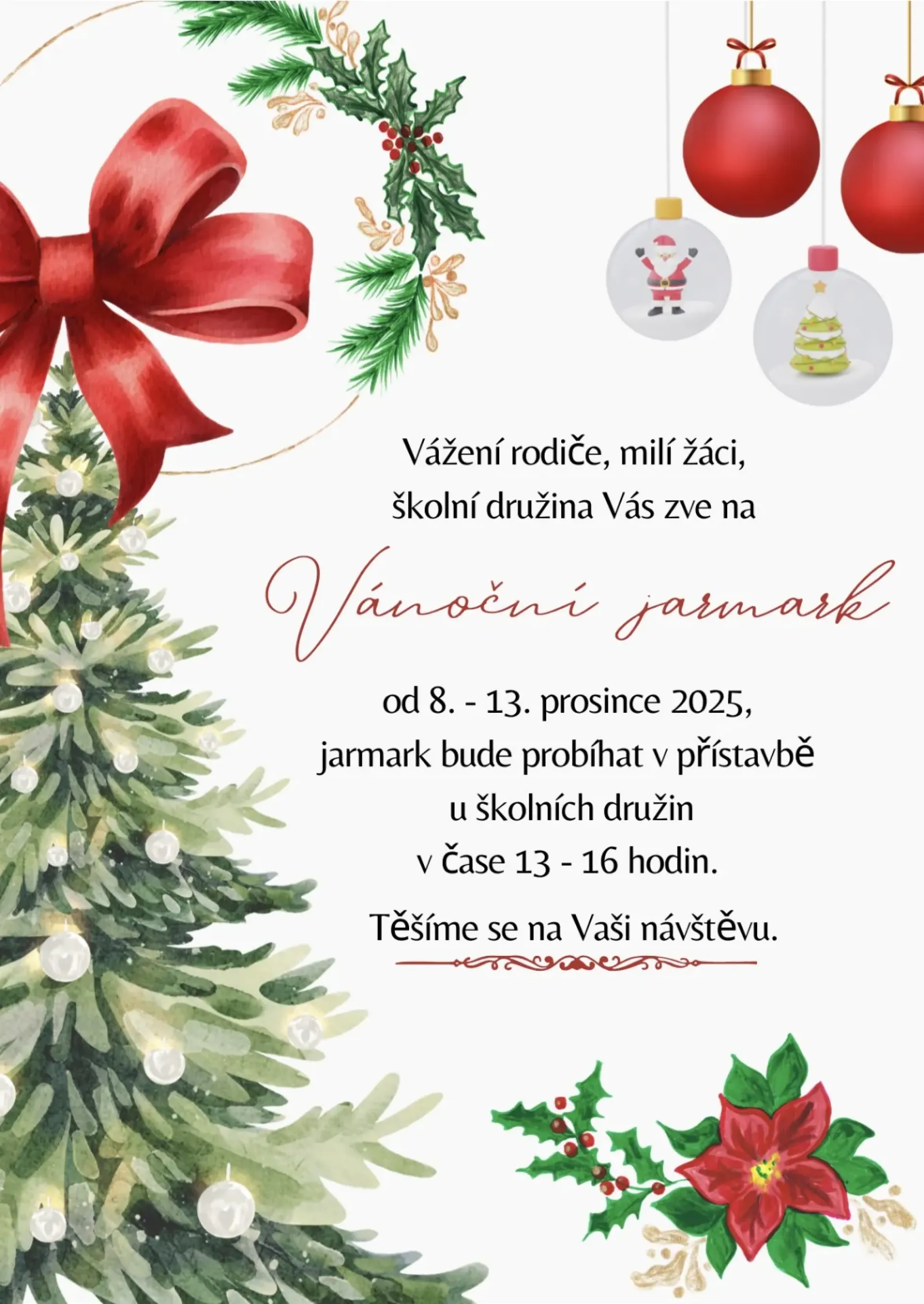 srdečně vás zveme na Vánoční jarmark, který se uskuteční 8.–13. prosince 2025 v přístavbě u školních družin.