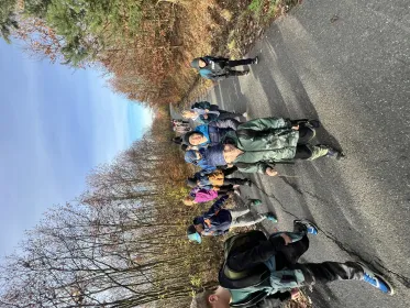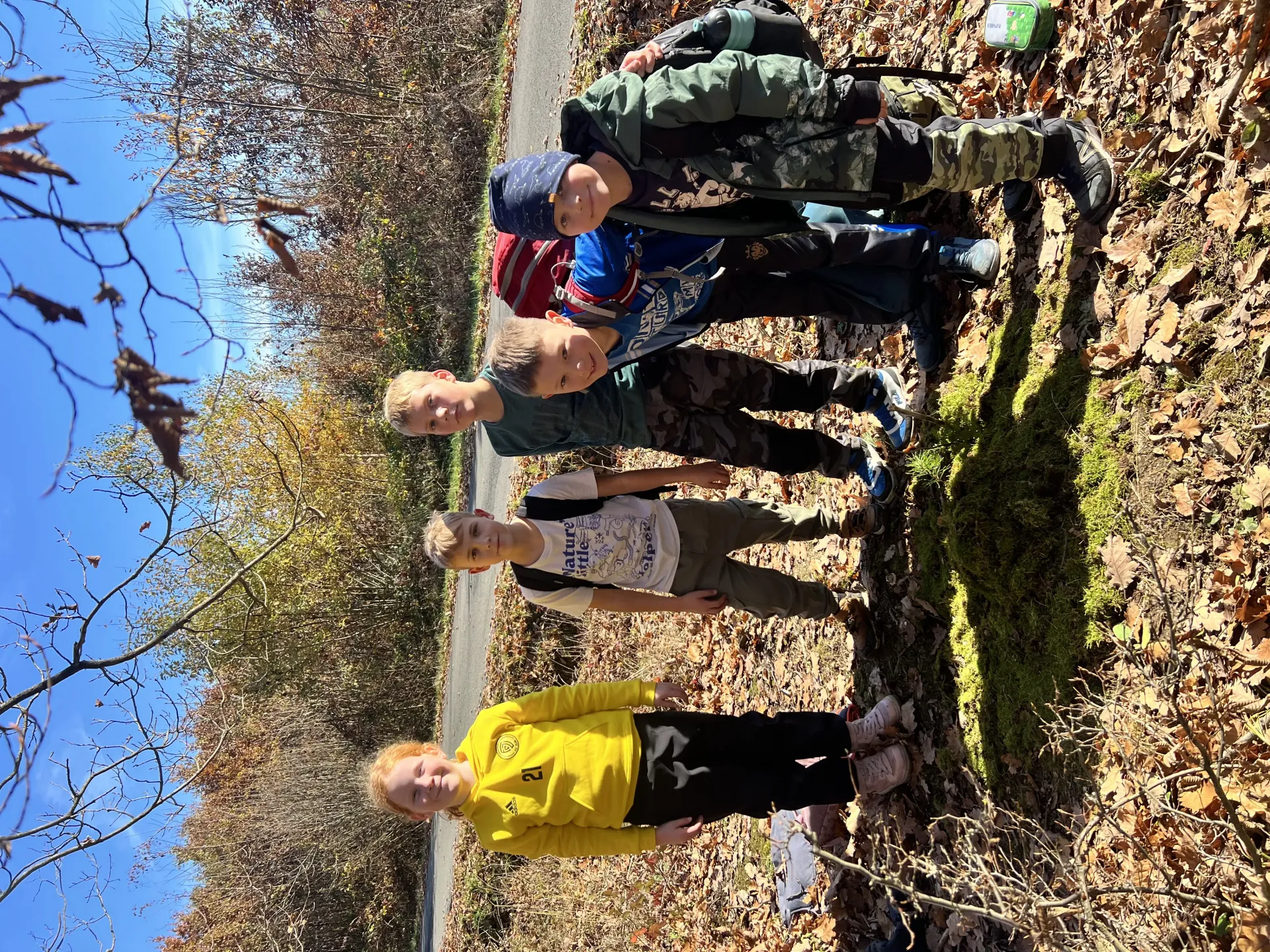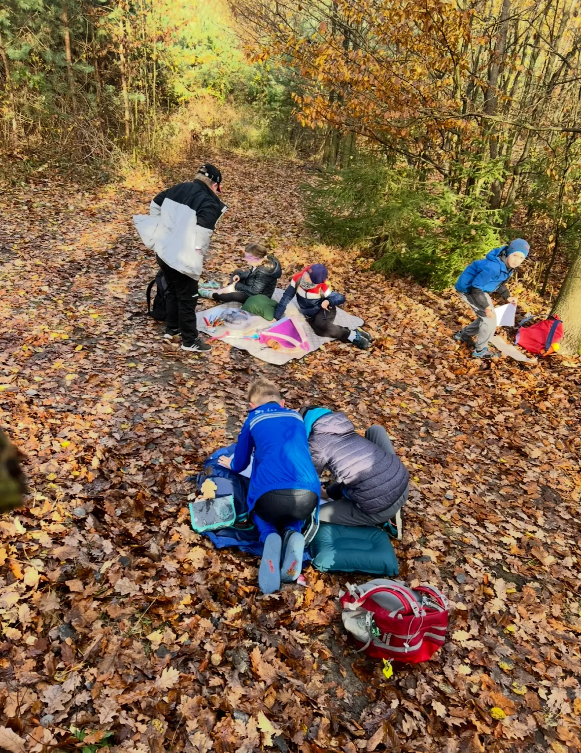 Cesta pokračovala do kopce lesní cestou, až k cestě asfaltové. Tam se šlo jedna báseň. Po cca kilometru jsme opět rozložili „tábor“ s podsedáky a s dekami. Tentokrát děti ve skupinách pracovaly na rébusech a pracovním listě na téma „rok v přírodě“. Všichni zvládli na výbornou. Cesta pokračovala a naše poslední stanoviště bylo v lese, do kterého se zrovna opíralo sluníčko. Někteří shazovali svršky, někteří si rovnou rozkládali deky a ve vodorovné poloze se nastavili slunci. Následovala hra v lese, kde bojoval každý sám za sebe, ale kamarádství nezadupeš, takže úkol splnili všichni. Ať už úplně samostatně, nebo s menší pomocí nenáhodných kolemjdoucích.