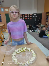Společně jsme si povídali o tom, proč je sušení zdravou a šetrnou metodou a jaké vitamíny v ovoci zůstávají. Poté si děti samy připravily kousky jablek a hrušek , které rozložily na sušící síta.